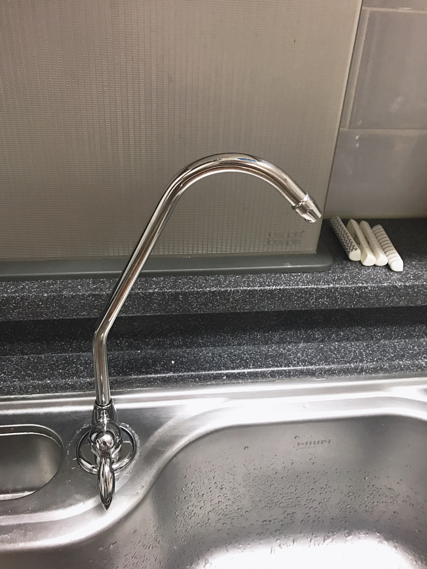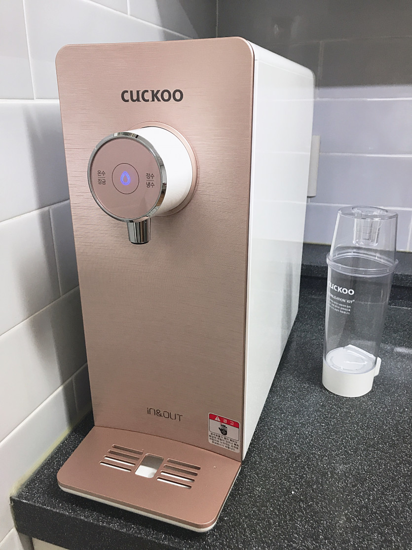 밥솥으로 유명한 쿠쿠의 가로 17cm 슬림한 직수형 냉온정수기. 이 제품을 선택한 이유의 반은 로즈골드 색상에 반한 것, 반은 조리수까지 설치 해준다는 것.